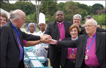 globe cut a cake with an inscription: ‘All may be one’,