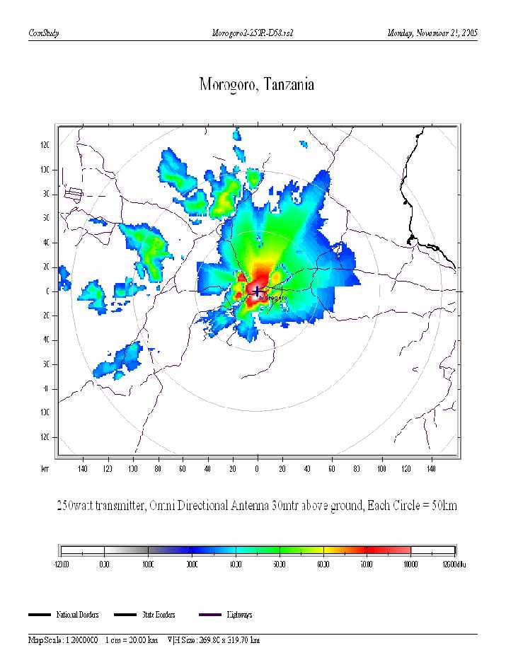 Thank God! The transmitter is working now! (See here putting the Transmitter) It has got even a powerful antenna now ( See here ) It had been donated from the Northelbian Mission to the ELCT Diocese in Morogoro. The Map at the bottom showes the expected range:
