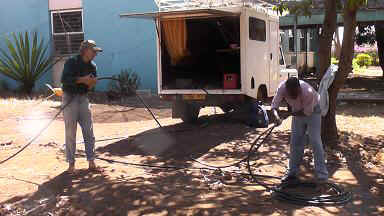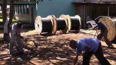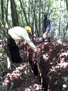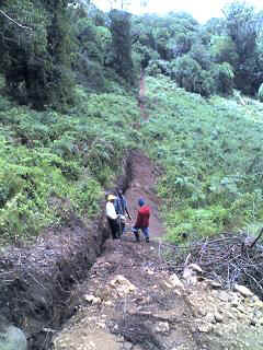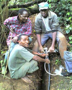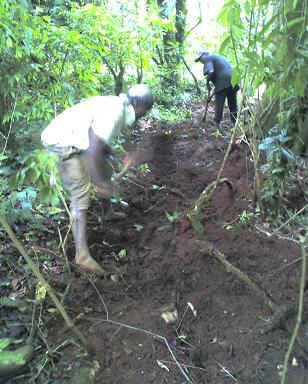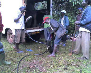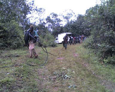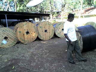 Yesterday we brought the fourth of the rollst of cable up to Kidia. Even though it looked like rain th ewhole day it did not rain until we came back when it really started to rain. On the next day we came back from Dar and Lushoto we had to get up to Kidia and check the ditch the first 1000m they had dug to lay the cable. Then we prepared the cable of the first reel. Since we could not brin the reel to the site because was too heavy, we had to take off the cable and bind it in bits one can carry alone. bitween the bits we left about ten meters to give enough space for the next person to carry his bit of load. So one ton of cable could be carried by 40 people up to thje ditch and be layed into it, even though no vehicle could teach there. But the cable had to be taken off the reel first! We had to bring one reel between two other ones and put a big steel pipe into it to spinn the cable off. But to move the 1000 kg by hand was not easy! Bringing the cable as close as possible gave us problems, because the rainy season had made everything muddy and slippery. There were many people at the side, because part of the ditch was filled with mud by the rain at night. After getting some soda and cake for every one we started to bring the cable to the ditch in a lon snail. Tomorrow we will lay the 5th kilometer of cable and we will reach the place where we asked for a electricity meter to connect it to the mains. As soon as the electricity reaches the transmitter we can increase the power of the transmitter to reach all listeners much better. We will not need the generator as often again, and we will save so much money on diesel.