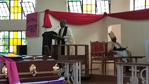 msoamaji wa familia akisoma historia ya Marehemu kanisani.