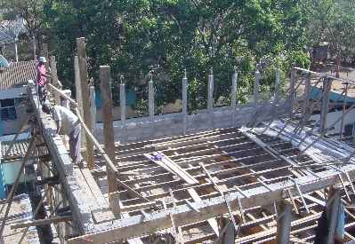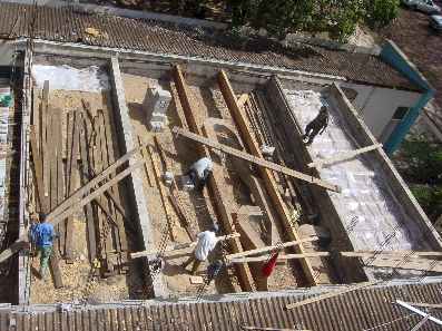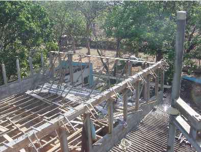 To stop this steep rafters and iron sheets should replaced the roof. Due to money restrain ,the iron sheets had been nailed on the original roof, which did not stop the leaking rally, because it was not steep enough. Now we got help from the Northelbian Mission to re-do the roof using streep rafters to bring down the rain on both sides. Because we are running out of space we pushed up the roof some bit to get 6 additional rooms for the FM department. The money available will not be enough to finish all those rooms. But the rains will stay out of the builiding tis year. That is what we are most thankful of! |